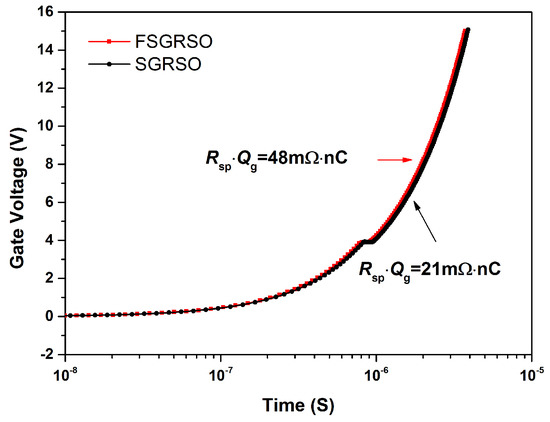 The relationship between the structure sizes of the FSGRSO UMOSFET and the BV is shown in Figure 7. The different values of the height (H1) and width (T1) for a floating electrode and the width of the source in the trench were considered. The effect of the equipotential gradually strengthen and the dense potential at the groove bottom gradually moved to the upper part with the increase of height in the floating electrode. Therefore, the BV of the FSGRSO UMOSFET was still higher than a device with ordinary construction. The BV of the FSGRSO UMOSFET achieved an optimal BV when H1 was 5.2 μm, which means that the potential line of the drift region reached an optimum state. If the length of the floating electrode was continuously increased or decreased, the balance would be broken and the breakdown voltage would decrease at the same time. The neighboring oxide thickness decreased with the increase of T2, which must be sufficient in order to provide the desired charge coupling and support the entire drain-blocking voltage. The result shows that the BV achieved an optimal value when the T2 and the oxide thickness were both 1.2 μm. The principle was the same as T1. To compare the characteristics of the FSGRSO and SGRSO UMOSFETs, we adopted the FOMs of BV2/RSP and RSP × Qgd. Figure 8 shows that the FOM (RSP × Qgd) of the FSGRSO UMOSFET is slightly higher compared with the SGRSO UMOSFET, because of the floating electrode, E1, which requires more research in the future.