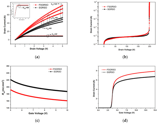 Characteristics comparing of the SGRSO and FSGRSO UMOSFET (a) output characteristics at VGS = 12, 8, 6, and 4 V (inset); (b) breakdown voltage; (c) ON-state resistance (Rsp); and (d) transfer characteristic.