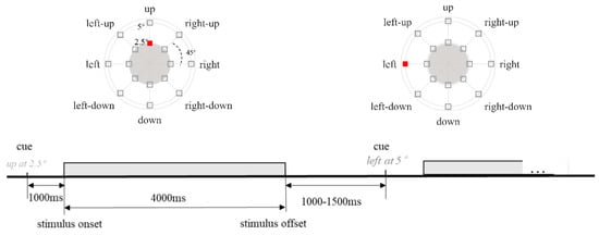 20], forming a flicker stimulus to elicit SSVEPs. The stimulus lasted 4000 ms in total. One small red square (0.25° × 0.25°) would appear on the screen to indicate where the participants should direct their overt attention during the experiment. There were 16 possible targets arranged surrounding the central circle at eight directions (left, left-up, up, right-up, right, right-down, down, and left-down) and two eccentricities (2.5° and 5°). Since a previous study observed a rapid drop of SSVEP responses when the stimulus presented beyond 5° away from the central fixation spot [