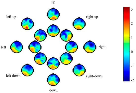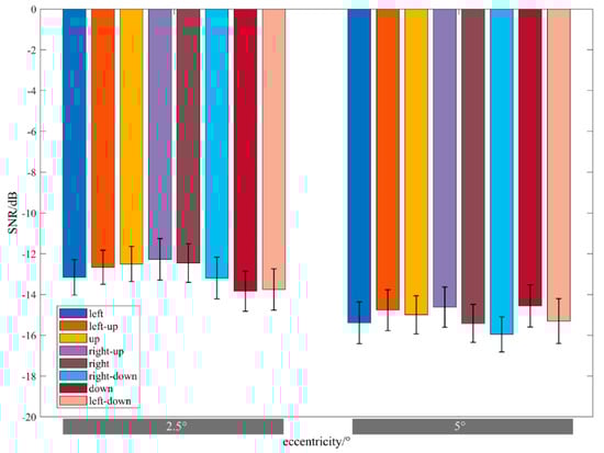 Finally, a two-way repeated measure analysis of variance (RMANOVA) with two within-subject factors, i.e., direction (left, left-up, up, right-up, right, right-down, down, and left-down) and eccentricity (2.5° and 5°), was conducted to determine their possible effects on the SNR of SSVEP statistically. p-Values smaller than 0.05 were considered statistically significant after Greenhouse–Geisser correction. Statistical analyses were performed with SPSS (22.0.0, IBM, Armonk, NY, USA).