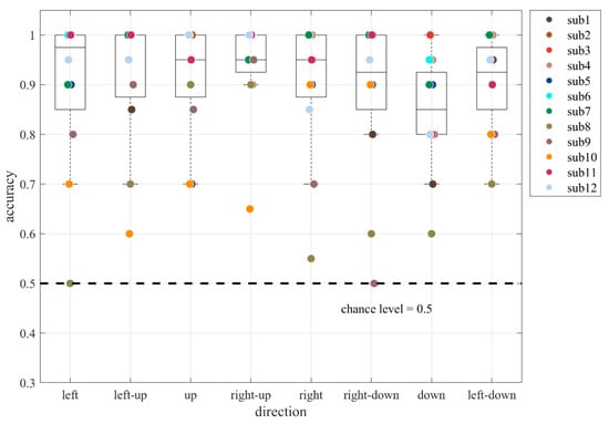 Figure 5, the 2-eccentricity classification achieved an accuracy of 89.6 ± 15.0%, 91.7 ± 10.7%, 89.6 ± 13.3%, 84.2 ± 11.0%, 91.7 ± 13.0%, 93.8 ± 9.38%, 87.9 ± 16.0%, and 90.4 ± 9.00% for left, left-up, up, right-up, right, right-down, down, and left-down, respectively. A RMANOVA was used to conduct a comparison and no significant main effect of the direction was found (F(7, 77) = 1.40,