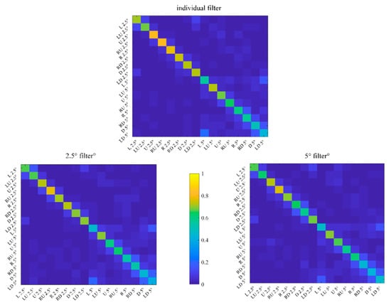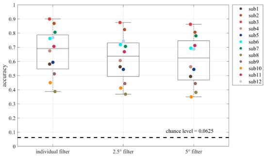 Figure 6. The accuracies were 66.8 ± 15.7%, 62.3 ± 15.5%, and 61.0 ± 16.4% for individual filter, 2.5° filter, and 5° filter, respectively. A decreasing trend can be observed in three conditions. A RMANOVA was used to conduct a comparison. A significant main effect of the filter type was found (F(2, 22) = 17.4,