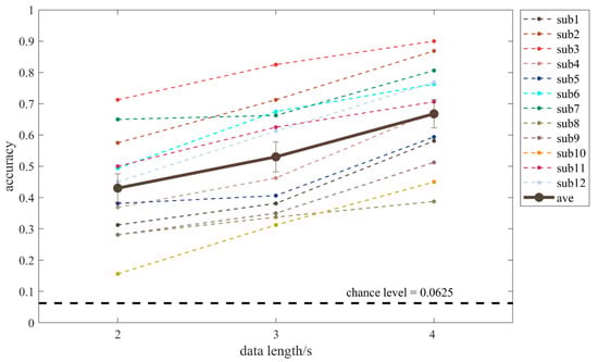 Figure 8, the accuracies were 48.6 ± 17.2%, 59.3 ± 15.5%, and 66.8 ± 15.7% for using data with a length at 2 s, 3 s, and 4 s, respectively. Although a decreasing trend could be observed, the 2-s data still provided accuracies well above chance level (