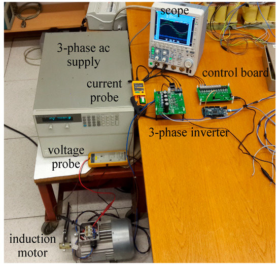 During measurements, each rotor shaft was mechanically locked to prevent its rotation. A three-phase sinusoidal power source, HP6834B (300 V, 4500 VA, 1Φ/3Φ, Keysight Technologies, Santa Rosa, CA, USA), was used for supplying the star-connected motors at a standstill. Due to its upper frequency limit of 5 kHz, in order to extend the test frequency range up to 20 kHz, a three-phase custom-made inverter operating in the six-step mode was used for the additional set of measurements, also guaranteeing almost sinusoidal motor currents. It consists of the three-phase IGBT Mitsubishi PS22A76 intelligent power module (1200 V, 25 A, Mitsubishi Electric Corporation, Tokyo, Japan) controlled by the Arduino Due microcontroller board (84 MHz Atmel, SAM3X83 Cortex-M3 CPU, Somerville, MA, USA). The Yokogawa DLM 2024 oscilloscope (Yokogawa Electric Corporation, Tokyo, Japan) with the PICO TA057 differential voltage probe (25 MHz, ±1400 V, ±2%, Pico Technology, Tyler, TX, USA) and LEM PR30 current probe (DC to 20 kHz, ±20 A, ±1%, LEM International SA, Plan-les-Ouates, Switzerland) were used to acquire motors’ phase voltage and current. The whole experimental setup is shown in Figure 4.