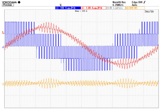 Details of experimentally obtained line-to-neutral voltage (blue trace), instantaneous current (red trace), fundamental current (grey trace), and current ripple (orange trace) for the 2.2 kW IM supplied by a three-phase inverter (centered PWM): Vdc = 300 V, fsw = 3 kHz and m = 0.5.