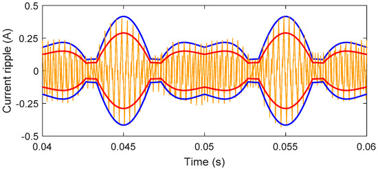 In Figure 8, the following waveforms are presented: Measured current ripple (orange trace, obtained by downloading the experimental data with a high sample resolution and post-processing in Matlab/Simu-link), current ripple envelope analytically calculated by using Leq = 17.36 mH, measured at fsw = 3 kHz (blue trace), and the current ripple envelope, analytically calculated by using Leq = 24.98 mH, measured at 50 Hz (red trace). The procedure of the current ripple envelope calculation is explained in detail in [9,14,15].