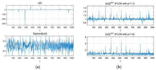 Figure 2 shows a comparison of the impulsive noise suppression ability between two theoretical algorithms. From Figure 2, we can find that both algorithms have suppression ability of the impulsive noise, however, the performance of the Sigmoid transform method is superior to that of the FLOS. Furthermore, it is worth noting that the suppression capacity of the FLOS method is affected by the fractional lower-order moment , where the suppression capacity of the FLOS with outperforms that of the FLOS with .