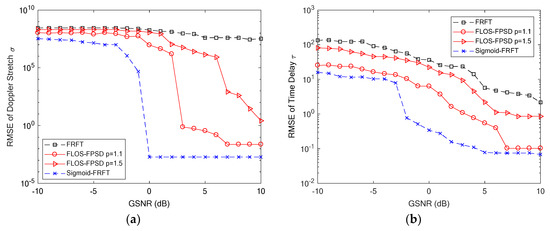 As shown in Figure 3c, the spectrum of the FLOS-FC does not have the energy-concentrated property at a specific rotation angle. The accurate rotation angle cannot be obtained. Therefore, the FLOS-FC method fails in this noise environment. The spectrum of the FLOS-FPSD is shown in Figure 3d, and we can find that the FLOS-FPSD algorithm also fails in the impulsive noise environment because the peak of the FLOS-FPSD cannot be easily separated from the impulsive noise in the FLOS-FPSD spectrum of the echo signal with impulsive noise. The FLOS-FPSD algorithm, combining the fractional lower-order statistics theory with the fractional power spectrum density function, can effectively suppress the Alpha-stable noise interference under certain impulsive noise environments. However, when impulsiveness is stronger or GSNR is lower, the FLOS-FPSD method fails. As shown in Figure 3c,d, the FLOS-FPSD algorithm fails in the impulsive noise environment with GSNR = 5 dB and α = 1.2 because the correct peak of the FLOS-FPSD cannot be obtained. On the other hand, the Sigmoid-FRFT spectrum of the echo signal with impulsive noise forms the obvious pulse, that is because the Sigmoid transform can restrain impulsive noise interference, as illustrated in Figure 3e. Compared with the FRFT of the echo signal with no noise, it is clearly seen that the results obtained from the Sigmoid-FRFT of the echo signal with impulsive noise matches quite well and with peaks at the same location. As analyzed in Section 4.3, the Sigmoid transform can suppress impulsive noise better than the FLOS. Therefore, the proposed method based on the Sigmoid-FRFT can effectively suppress impulsive noise interference, yields an accurate peak estimation and has a better estimation performance.
