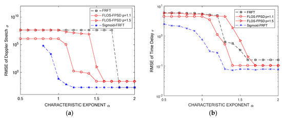 RMSE of parameters versus Characteristic Exponent . (a) RMSE of Doppler stretch; (b) RMSE of time delay.