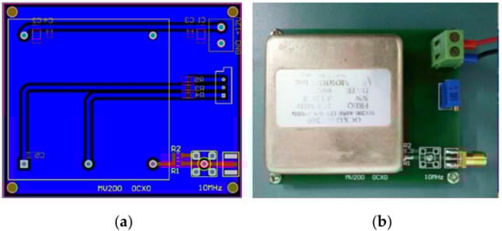 The photograph of the common oscillator is shown in Figure 4. The core device was an oven controlled crystal oscillator MV200, of which the nominal frequency was 10 MHz. The operating voltage of the common oscillator module is +12 V. Three resistors and one precision potentiometer VR (the blue block devices on the right side of circuit board in Figure 4b) provided an accurate bias for MV200. By adjusting the potentiometer, the output of the common oscillator SMA-0 (SMA-1 as a backup output, which can be used as a test point) could be stable at 9.999999 MHz. Figure 4a is the PCB (Printed Circuit Board) photograph of the common oscillator designed in this paper, and Figure 4b is its physical photograph.