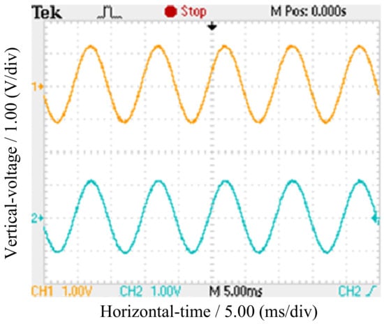When the output of the common oscillator is 9.9999 MHz and 2.88 Vpp, and the signals to be measured and the reference signal are10 MHz and 3.20 Vpp, the actual outputs of the frequency down-beater were as shown in Figure 6. The frequency of the two sinusoidal beat signals was 100 Hz, and the peak to peak voltage was about 2.30 Vpp.