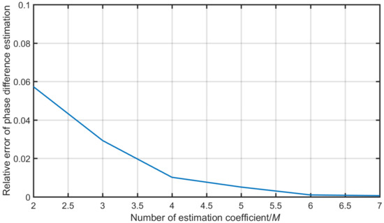 It can be seen from the recurrence process described in Equation (22) that the number of estimation coefficient M is the main factor affecting the accuracy of phase difference estimation. Additionally, in order to evaluate the accuracy of Chebyshev estimation mentioned above, we designed the following experiment. Two 100 Hz sinusoidal signals (with a presupposed phase difference, e.g. 5) were generated by the function signal generator SDG5162. After data acquisition and processing by the circuit board shown in Figure 7, the accuracy of phase difference calculation by Chebyshev estimation method can be observed with the on-line debugging tool SignalTap II. Figure 9 shows the effect of the number of estimation coefficients M on the phase difference estimation accuracy. As can be seen from Figure 9, with the increase of the number of estimation coefficient, the accuracy of phase difference estimation gradually improved, and the relative error of phase difference estimation was close to 0.005 when M = 5. However, this improvement becomes insignificant when the coefficient is greater than 6. In our design, the number of estimation coefficient was set to 6 on a trade-off between estimation accuracy and logical resource consumption of system.