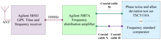 Experiment 1: The 10 MHz output of Agilent 58503 GPS time-frequency reference receiver was divided into two identical signals by the Agilent 5087A frequency distribution amplifier. Subsequently, they were sent to a phase noise and Allan Deviation test set TSC5110A’s input channel and its reference frequency channel via coaxial cable M and N. Subsequently, a phase difference measurement was carried out, and the measurement result was recorded as △φ1. In order to add a small amount of phase delay to one of the signals, the coaxial cable H was continued at the rear end of the coaxial cable N. At this time, the two signals of the Agilent 5087A output were input to the TSC5110A by the coaxial cable M and the coaxial cable N+H to perform phase difference measurement, and the result was recorded as △φ2. Record the amount of phase delay introduced by coaxial cable H as △φC-5110A. Then, there is:
