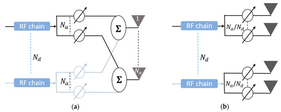 Recently, heterogeneous networks (HetNets) that use massive multiple-input multiple-output (MIMO) and millimeter-wave (mmWave) technologies has emerged as a promising solution to enhance the network capacity and coverage of next-generation 5G cellular networks [1,2,3,4,5,6]. Small cell deployment in HetNets can achieve high signal to interference plus noise ratio (SINR) and dense spectrum reuse, mmWave can address the current challenge of bandwidth shortage, and the large number of antenna arrays [7,8,9,10] are essential for mmWaves to compensate for channel attenuation. In Reference [11] we applied the concept of massive multiuser (MU)-MIMO to enhance both the access and the backhaul links in HetNets, and it was shown that such a concept could significantly improve the system performance in terms of link reliability, spectral efficiency, and energy efficiency. Traditional MIMO-beamforming systems require a dedicated radio frequency (RF) chain for each antenna element, which becomes impractical with massive MIMO systems due to either cost or power consumption. To reduce the number of RF chains, hybrid beamforming (HBF), which combines RF analog and baseband digital beamformers, has been proposed as a promising solution [12,13,14,15,16,17]. Figure 1 shows a general hybrid configuration that connects antenna elements to RF chains, where , using an analog RF beamforming matrix built from only phase-shifters. Two widely-used analog beamformer architectures for hybrid beamforming are shown in Figure 2. The fully-connected hybrid beamforming structure of Figure 2a provides a full beamforming gain per transceiver—but with high complexity—by connecting each RF chain to all antennas through a network of phase shifters [12,13,14,15]. Figure 2b, on the other hand, shows a partially-connected structure, where each RF chain is connected to number of sub-arrays. Such a structure has a lower hardware complexity at the price of reduced beamforming gain.