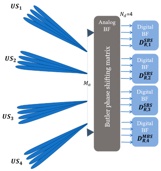 Assuming channel reciprocity with , the receive analog weight vectors of the MBS are given by . It should also be noted that the MBS is using a different analog matrix for each SBS, which can be implemented using the Butler matrix of Figure 4, where mobile users are replaced by SBSs.