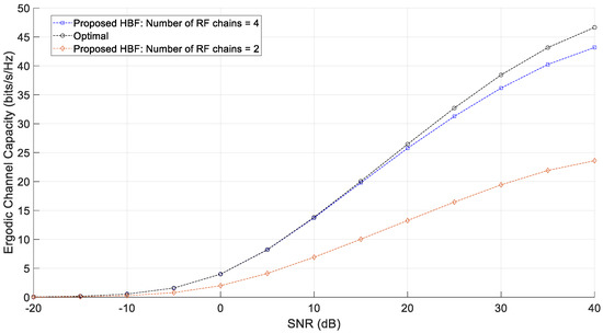Ergodic channel capacity of the proposed HBF for different number of RF chains.