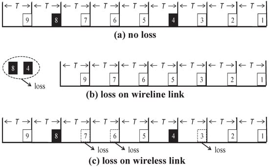 Packets of the same flow are marked as (packets with high priority) and (packets with low priority) at sender. As shown in Figure 2a, the sender sends 9 packets,,,…, and are marked as low priority. When the load of the network is too heavy or the router cache overflows, lower priority packets are dropped first. As shown in Figure 2b, and are dropped in router because of congestion. The will be dropped while there are no in queue. When packet loss occurs in the wireless link, the loss probability of packets with different priorities is the same. As shown in Figure 2c, , and are randomly dropped. The receiver counts the packet loss pattern to matches the packet loss category. The statistical index can be given by