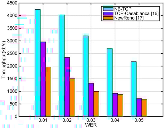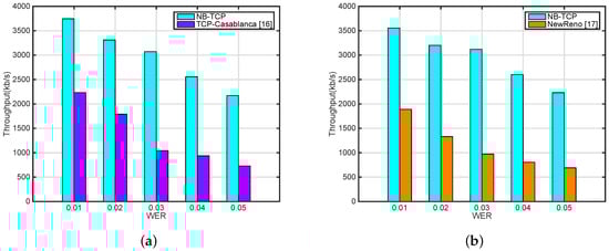 The friendliness is reflected in the degree to which different TCP protocols, which share the bottleneck link, interact with each other. To prove that NB-TCP is friendly to other methods and will not preempt shared resources unduly, the experiment uses two groups of senders and receivers to establish two flows. One flow is configured with NB-TCP and the other is configured with a comparison method. The average throughput of two flows is measured under different WER. Figure 6a,b shows the friendliness of NB-TCP algorithm under different WER. Although the improved method is more competitive to network resources, the distribution of resources is stable. Compared the average throughput performance in Figure 3, although the NB-TCP throughput is higher, the average throughput of TCP-Casablanca and NewReno has not been greatly affected.