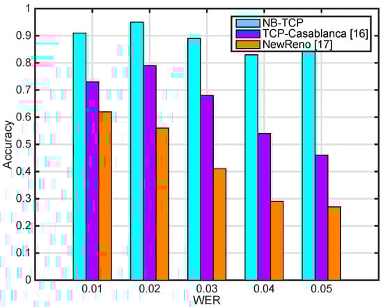 Figure 4 shows the accuracy versus WER for the three methods. It can be seen that NB-TCP has a high accuracy, and is almost higher than the comparison methods with the increase of WER. When the WER is 0.02, the rate of correct classification packet loss types can reach up to 95%, and the overall probability remains above 85%. The accuracy of TCP-Casablanca and NewReno methods is less than 50% at a WER of 0.05. This shows that NB-TCP improves the classification accuracy. Comparing Figure 3 and Figure 4, the performance of NB-TCP is better with the higher WER.
