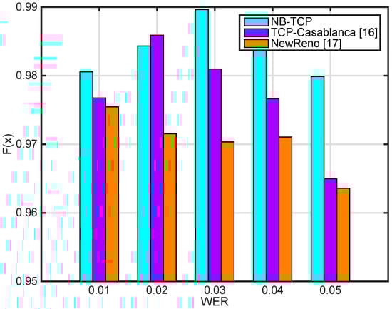 where s is the number of flows and is the average throughput. When is closer to 1, the fairness is the best and represents the absolute fair distribution of network resources. When the value is , it indicates that the network resource allocation is seriously unfair, it is monopolized by one flow. This experiment uses 10 flows to calculate the fairness index of three methods, respectively, and simultaneously send data to count the average throughput of each flow. Figure 5 shows the fairness index of NB-TCP and its comparison methods under different WER. It can be seen that the fairness index of all three algorithms exceeded 0.96, among which NB-TCP fairness index is higher, close to 1, indicating good fairness.