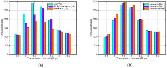To evaluate the impact of transmission data rate on throughput performance, we use four TCP connections and keep the WER at 0.05 to ensure more obvious performance with enough loss packets. Figure 7a plots the average throughput versus transmission data rate. It shows that throughput increases with the increment of transmission data rate increases before 1.5 Mbps, but decreases after that. When the congestion loss increases, network performance degrade obviously. For the same transmission data rate, our proposed algorithm still achieves a better performance. Figure 7b shows the throughput performance comparison of the improvement method with different sample sizes. It shows that the throughput is obviously different between 200, 500 and 1000 samples before 1.5 Mbps. This is due to large sample size can ensure greater accuracy.