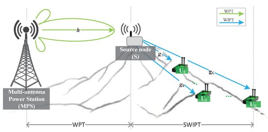 Recently, the exponential growth of wireless devices (WDs) and the requirement of the communication services are causing scarcity of energy. Moreover, most WDs, such as smart electronic terminals and wireless sensors, are powered by capacity-limited batteries, which restricts the working lifetime of energy-constrained networks, e.g., wireless sensor networks (WSN), Internet of Things (IoT), and wireless personal area networks (WPAN) [1,2,3,4,5]. To provide sustainable energy to WDs in energy-constrained networks, energy-harvesting (EH) technology has emerged as a promising solution [6,7,8]. In the EH family, solar, wind, thermal, and vibration energy are very popular renewable energy resources. However, because of their unpredictability and uncontrollability, it is difficult for them to support sustainable and reliable communications [9,10,11]. Moreover, there is another kind of energy source, i.e., radio-frequency (RF) energy, which delivers energy via RF signals. Since RF signals are controllable and independent of external conditions including weather and climate, RF-based EH is considered to be a promising solution to provide stable energy for low-power energy-constrained networks [12,13].