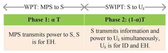 Let T be the total time period of the system transmission. A WPT-SWIPT protocol is presented, where is T divided into two phases with a time assignment factor . The first phase is the WPT phase with time interval , and the second one is the SWIPT phase with time interval , as shown in Figure 3.
