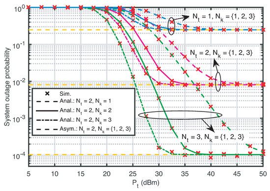 Figure 4 shows the effect of the transmit power at on the system outage probability with different antenna numbers at and , i.e., . It is seen that the results of theoretical analysis match the simulation results obtained by Mont Carlo measurement with realizations very well, which verify the correctness of our theoretical analysis. Moreover, as the numbers of antennas increase at and , the decreasing rate of the system outage probability increases due to the gain of multiple antennas. At the same time, the system outage probability decreases with the increment of , because large usually leads to high SNR. Moreover, when is large enough, i.e., , the system outage probability is not affected by the number of antennas at but is affected by the number of antennas at , which is consistent with the asymptotic outage probability of the system in (14).