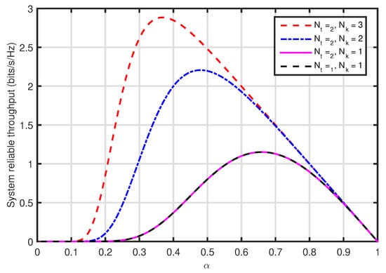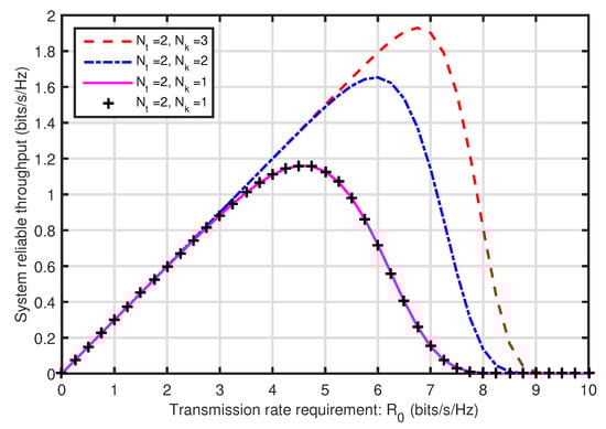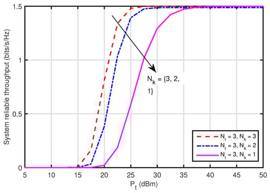 Figure 5 plots the system reliable throughput versus the transmit power at , where . The results of the system reliable throughput respond to the results of the system outage probability associated with in Figure 4. It can be seen that the system reliable throughput is improved as the antenna numbers at increases, because the system outage probability is reduced because of the multiple antenna gain at .