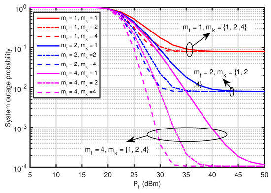 Figure 8 compares the impact of the shape parameter of Nakagami-m channels m on the system outage probability versus the transmit power at . It shows that the system outage probability associated with and is largest, because when and , the transmission channels follow the Rayleigh fading. Moreover, the system outage probability is decreased with the increment of when , and vice versa. That is, m is larger, the system outage probability is lower.