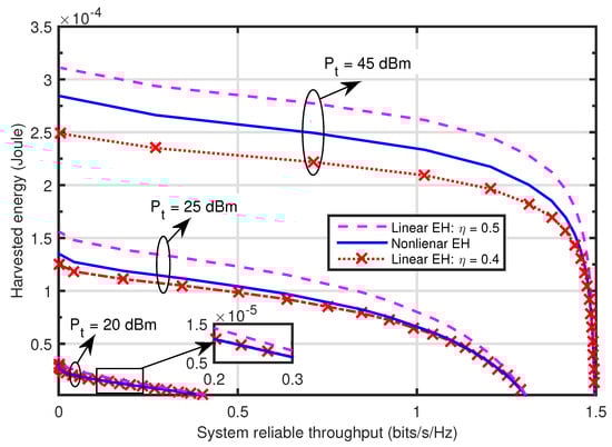 Figure 9 shows the region between the system reliable throughput and the amount of energy harvested at with different transmit power at , i.e., - region. To compare the impact of adopting the linear and LG nonlinear EH models at on the - region, we set for the linear EH model. It can be observed that the - region under the LG nonlinear EH model is smaller than that under the linear one with . While, when and dBm, the region is the same for the two EH models. That is, when , the same system performance can be obtained under both EH models. That is why the achievable RF power at is relatively low, the results under the linear EH model is closed to that under the LG nonlinear one, which is also observed in Figure 2. When and 45 dBm, the regions with both EH models are different due to the saturation characteristics of the EH circuit. Since the LG nonlinear EH model is closer to the features of practical EH circuit than the linear one, using the linear EH model causes the false achievable system performance output. This observation is consistent to that in [23,24,25,26,27,28,29,30,31,32,33,34].