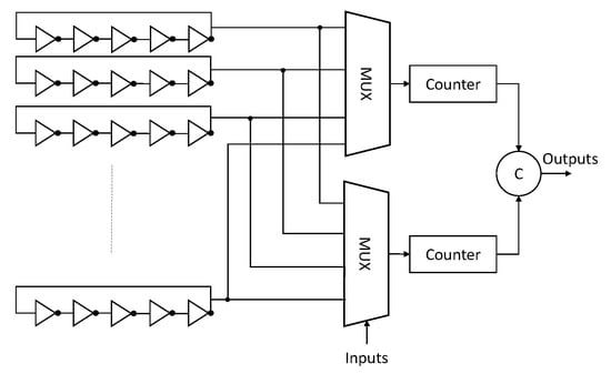 A n-bit signature can be generated by comparing several ROs. These ROs are typically implemented in a two-dimensional matrix using hard-macros. This CRP generation method based on ranking of individual RO frequencies has some limitations from a security point of view [,]. A major limitation is related to the straightforward comparison between frequencies, which allows an attacker that has knowledge of two response pairs to derive the response of a third one; e.g., when 1 ( < ) and = 0 ( < ) = 0 ( < ). Another major limitation is the loss of information in the comparison process, as only the sign bit of the frequency difference between ROs is considered and not the frequency itself. Therefore, a higher number of ROs are required to distinguish between several chips. Finally, the placement of ROs has a big impact on the RO frequencies. Systematic process variations may dominate the generated frequency responses if the RO pairs under comparison are randomly selected []. To overcome this limitation, several proposals ranging from comparing only oscillators which are direct neighbors to signature post-processing can be found in the literature [,].