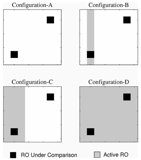 The idea behind different background noise configurations is to impact the frequency of ROs under comparison by intentionally enabling other ROs from the RO-PUF matrix as a noise source. We considered four background configurations, as shown in Figure 2. Configuration-A is the typical configuration where only the two ROs under comparison are activated. In Configuration-B, the ROs of the same column of one of the ROs under comparison are activated. Configuration-C expands on Configuration-B by having the neighboring columns also activated. Configuration-D activates all the ROs in the matrix. It is important to note that we selected only column configurations (instead of rows), as they have a higher impact as a result of the FPGA power line distribution.