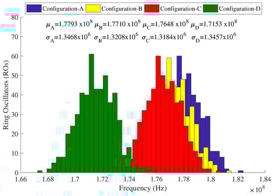 Figure 3 displays four histograms of the 512 measured frequencies for the different background configurations. As expected, the switching activity generated by the active ROs causes a frequency decrement. Note that, although the absolute frequency of the RO-PUFs changes, the change in differential value (i.e., the comparison result of the two ROs under comparison) in the case of the same background configurations is negligible, as observed by the state-of-the-art. This can be clearly seen also from the similar standard deviations that the four configurations have. In addition, the figure shows that Configurations B and C also affect, although to a lesser extent, the RO frequency. If such background configurations are used, they will reduce the reliability of CRPs as the frequency difference of two ROs is less. To overcome this limitation, we propose to carry out the frequency acquisition in two separate steps:
