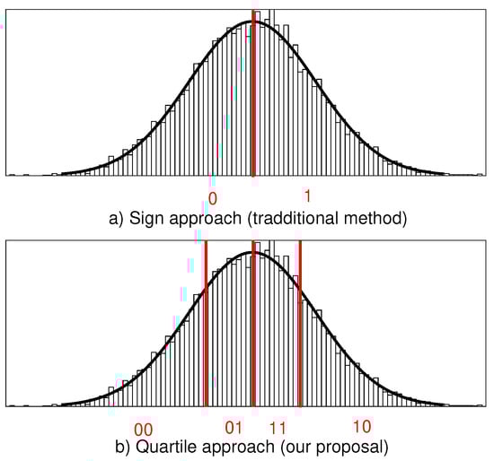 The quantization phase of the traditional rank-based method in Figure 4a only takes into account the sign bit of the comparison, omitting some interesting information as the frequency differences between ROs. Although this loss of information results in more reliable responses, a large penalty is paid in terms of unused bits. To overcome this drawback and expand the number of bits generated by each challenge, we propose to define four contiguous intervals in the frequency range with equal probabilities (i.e., quartiles). As shown in Figure 4b, each comparison generates a 2-bit response thereby doubling the number of bits responses compared to the traditional method. Other divisions can be explored to increase the number of bits per challenge when the penalty in reliability is acceptable. To increase the reliability, we present an CRP reliability enhancement scheme in the next section.