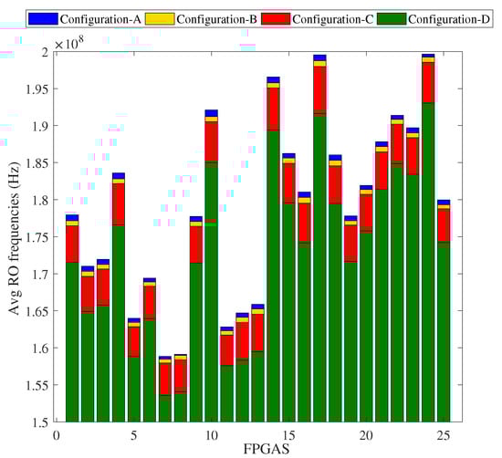 Figure 5 depicts for each FPGA the average frequencies of the 512 ROs for the different background configurations; each RO was measured 100 times for all background configurations. The figure clearly shows that the frequency trend observed in Figure 3 is applicable in all FPGAs. The average frequencies for the different background configurations ranged from 157.94 MHz (lowest average frequency for Configuration-D) to 199.64 MHz (highest average frequency for Configuration-A). With respect to Configuration-A, the mean shift measured from all FPGAs equaled 620 KHz (0.34%) for Configuration-B, 1.28 MHz (0.71%) for Configuration-C and 6.27 MHz (3.5%) for Configuration-D.