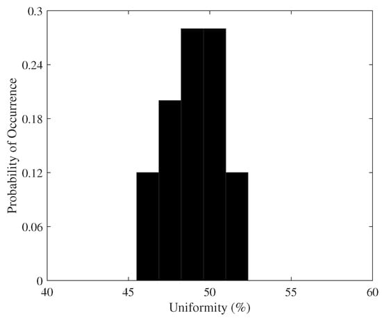 where represents the lth-bit of an n-bit response of FPGA i. Note that our method has an n that is twice as large as compared to the conventional approach, as we doubled the number of bits taken from each comparison. The results of the uniformity metric for the 25 FPGAs are shown in Figure 6. The obtained results are close to the ideal value, i.e., a uniformity of 50%. In fact, the average value of all the 25 FPGAs is 50.01%.