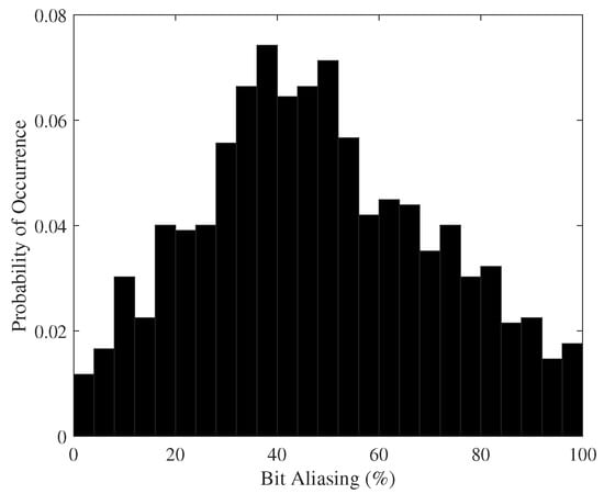 where k is the number of devices and is the lth-bit of an n-bit response of the device i. The ideal bit aliasing value of a response equals 50%; this indicates that there is an equal distribution of “0 s” and “1 s” between the different devices. Figure 7 shows a histogram of the bit-aliasing distribution. Although the response is centered around the ideal value, it can be observed that some bits have a fixed value in all FPGAs (i.e., a 0% or 100% bit-aliasing value). The RO pairs that generate these fixed values in all the FPGAs can be discarded at enrolment phase.