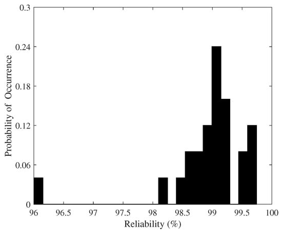 where x is the number of samples of a n-bit response and is the Hamming distance between the yth sample and the reference response. In our experiment, we took x = 300 samples for each RO response over a period of three weeks in normal conditions (i.e., core voltage of 1.2 V and room temperature of C). Therefore, we collected a total amount of 300 (samples) × 25 (FPGAs) × 100 (ROs) × 2 (number of used bits per comparsion) = 1.5 million bits. Figure 8 shows the histogram of these bits, i.e., the results of the reliability. The reliability of the responses is generally high with a mean value of 98.95%. It is noteworthy that only one FPGA of the set has slightly worse results. This may be due to noise (such as the noise generated by power supply problems), making the responses unstable for this particular FPGA (D427923).