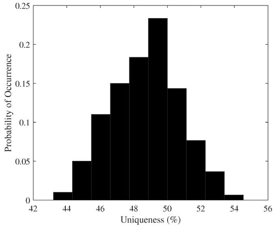 where k is the number of devices and is the Hamming distance between the n-bits responses of chip i and j. The ideal value of uniqueness is 50%. The distribution of the uniqueness metric for the 25 FPGAs is shown in Figure 9. On average, the uniqueness obtained for the enhanced proposal is 48.86% with a standard deviation of 3.43. The minimum and maximum values of the uniqueness are 43.76% and 53.96%, respectively.