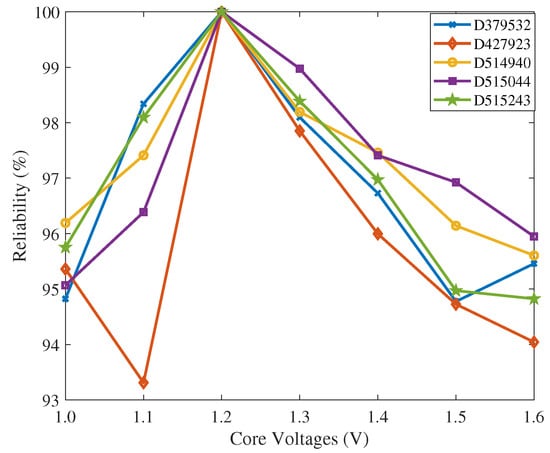 As aforementioned, the stability of the PUF response under different operations conditions is of paramount importance. The reliability of the responses was analyzed using 5 of the 25 boards. To model the impact of environment, we considered variations in the supply core voltage ranging from 1.0 V to 1.6 V in steps of 0.1 V. The reference response was obtained at the nominal FPGA supply voltage provided by the manufacturer (i.e., 1.2 V). Figure 10 shows the impact of voltage variation on the reliability. The voltage variations cause a lower reliability with a minimal value of 93.3% (1.1 V). Note however that these results are in general still good. The worst results were obtained for FPGA D427923, which was purposefully selected as it had the lowest reliability and therefore would give a lower bound on this metric. As expected, the reliability is high near the nominal core voltage (1.2 V) and gets worse as soon as the supply voltage deviates from this point.