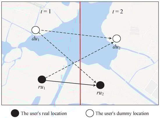 In the real world, the adversaries can easily obtain the map information from the Internet, thus, they can easily exclude the dummy locations according to the geographic feature of the area that the dummy locations belong to. For example, if the adversaries have captured a location of a user and know the area around the user is a lake, thus, they can derive that the captured location is a dummy location. Therefore, some related works divide the region into different areas according to the geographic feature to generate the dummy location with high privacy level [14,28]. In [28], Niu et al. proposed an online k-anonymity-based trajectory protection scheme, i.e., enhanced dummy-location selection (enhance-DLS). In this scheme, the region is divided into different areas according to the geographic feature. They used entropy metric to measure the privacy level between different areas. The entropy is calculated according to the query probability and the transition probability. The query probability is the probability that a user launches a query in an area and the transition probability is the probability that a user moves from an area to another. However, the DLS scheme assigned the transition probability randomly without considering the realistic user mobility pattern. The user mobility pattern reflects the commuting flow for a user from one area to another. If the user mobility pattern is not considered to generate dummy trajectories, the adversaries can easily exclude the dummy trajectories according to the obtained geographic feature information. For example, a user utilizes a 2-anonymity scheme to protect the real-time location as shown in Figure 1. We denote as the real user’s location at moment t, and is the dummy location of the user at moment t. For t = 1 and t = 2, the scheme generates 1 dummy location respectively. If the adversaries has learned that there is a lake between and , and , and , thus, they can easily exclude the dummy trajectories , and . As a result, the adversaries can successfully derive the real trajectory by inference. Therefore, the user mobility pattern is an important factor which should be considered to calculate the user commuting flow and further obtain accurate transition probability between two areas, thus, creating dummy locations with a high privacy level.