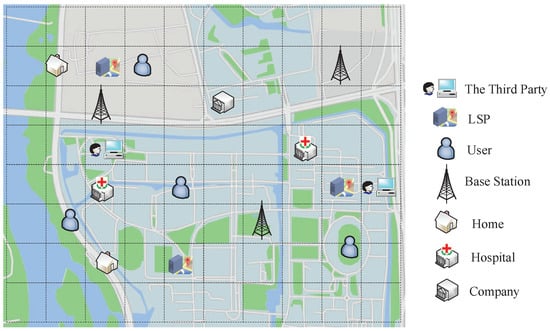 The users, LSPs, third parties and the base station are distributed in the region as shown in Figure 2. The LSPs usually refer to the servers of the large companies, e.g., Google and Baidu. The LSPs can provision location based services to users through communication network [37,38,39,40]. The LSPs store the users’ historical trajectory data in a storage module while provisioning the continuous LBSs to the users. The users move in the region according to the human daily activities. Each user is equipped with a mobile device. The mobile device is usually storable and computable, which receives the location-based service (such as smartphones, tablet personal computers and wearable devices). The mobile device can obtain the historical trajectory data of the users in the region from the LSP and store the trajectory data in a storage module. The trajectory data stored in the storage module is updated in each time period. Each mobile device and the LSP have a gravity model module, which can construct the corresponding gravity model based on the stored historical trajectory data. Moreover, each mobile device and the LSP also have a dummy-fuse module to generate dummy location data. The dummy-fuse module calculates the query probabilities of the grids in the region according to the historical trajectory data in the storage module, and uses the gravity model constructed in the gravity model module to calculate the transition probabilities between different grids in the region. Then, the calculated query probabilities and the transition probabilities are stored in the dummy-fuse module.