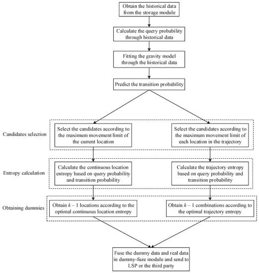 - The dummies are obtained based on the corresponding entropy metric. In continuous LBS, the locations corresponding to the optimal continuous location entropy is selected. On the other hand, the location combinations corresponding to the optimal trajectory entropy is obtained.