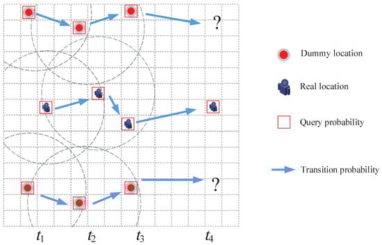 We first review the related trajectory protection schemes in continuous LBS. To protect the trajectory data in the continuous LBS, Kido et al. [14] proposed two dummy trajectory generation algorithms that generate dummies without relying on the third party. The next dummy location is determined according to the users’ neighborhood location. The algorithms employ a random walk model to generate dummy locations without considering the user movement pattern. Xu et al. [17] proposed a k-anonymity-based trajectory protection scheme that employs other users’ historical trajectories to generate dummy trajectories. It ensures the authenticity and validity of the other dummy trajectories, which makes it harder for adversaries to infer the real users’ trajectories when the mobile user launches continuous LBSs during his movement. However, due to the query probability and the transition probability not being fully considered, the adversary can infer the user’s real trajectory with a large probability.