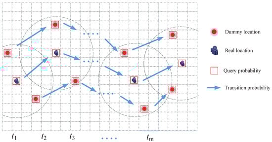 Let be the trajectory of the generated k trajectories. Assuming the length of a trajectory is m, the trajectory with the location data generated at moments can be denoted as , where is the grid where the user is located at moment on the trajectory.