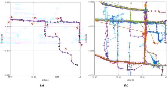 An illustration of user’s trace and sample data of users’ trace. (a) trajectory of a user; (b) trajectories of all users.