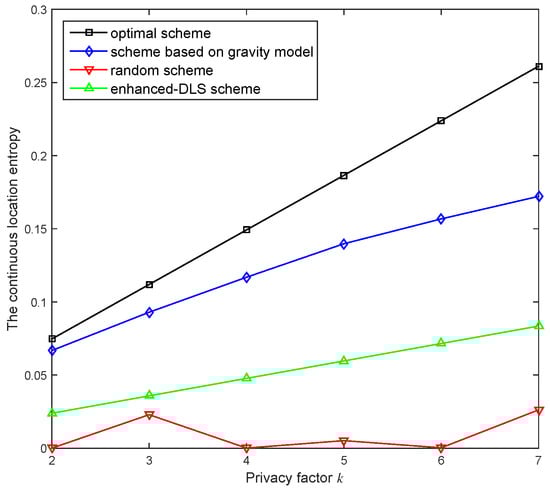 Figure 8 compares the continuous location entropy of the proposed trajectory protection scheme with the enhanced-DLS scheme, the optimal scheme and the random scheme. We can see that the continuous location entropies of the four schemes increase with the privacy factor k increasing. This is because the number of dummy trajectories increases with the increase of the privacy factor k. Therefore, it is more difficult to capture users’ real-time locations. From Figure 8, it can be seen that the optimal scheme has the highest entropy for the same privacy factor k. This is because the optimal scheme selects dummy locations with the maximum entropies from the whole region to generate the dummy locations, while the other schemes select the dummy locations with maximum entropies within a reasonable limited region. Moreover, it can be seen that, for the same privacy factor k, the entropy of the proposed scheme is larger than those of the enhanced-DLS scheme and the random scheme. Compared with the enhanced-DLS scheme, the continuous location entropy of our scheme is improved by by 179.77%, 159.75%, 144.96%, 134.35%, 119.04% and 106.2%, when the privacy factors are 2, 3, 4, 5, 6 and 7, respectively. This means that the proposed scheme generates trajectories with better uncertainty, so it is very difficult for the adversaries to identity the real trajectory from the dummy trajectories, i.e., the privacy level of our scheme is high. This is because the enhanced-DLS scheme and the random scheme generate dummy locations without considering the user movement pattern, thus, resulting in great differences between the consecutive dummy locations which can be easily identified as dummy locations by adversaries.