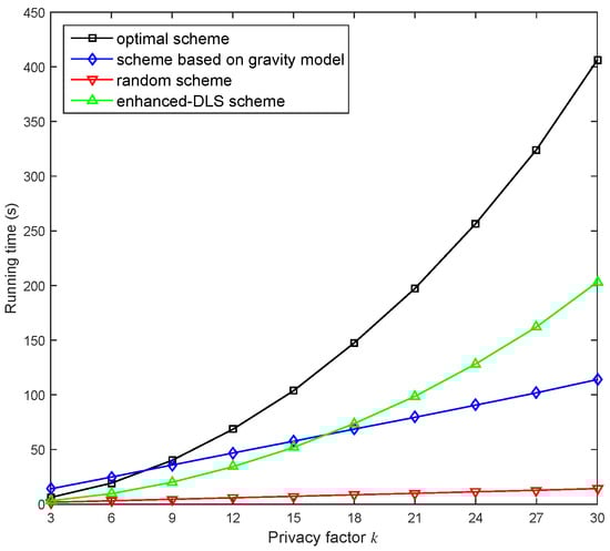 Figure 9 compares the running time of the proposed scheme with the enhanced-DLS, the optimal scheme and the random scheme. It is seen that the running time of the four schemes increase with the increase of the privacy factor k. This is because the number of dummies increases with the increase of the privacy factor k, and thus, the schemes would spend more time to generate more dummies. Moreover, It is seen that, for the same privacy factor k, the running time of the proposed scheme is larger than that of the random scheme and smaller than that of the optimal scheme. This is because the optimal scheme needs to traverse all the grids and calculate the maximum entropies of all grids to determine the dummies, while our scheme only needs to select the grids in a limited reasonable area and calculate the maximum entropies of the selected grids to determine the dummies. The random scheme directly selects k dummies randomly without comparing the entropy, hence, it spends less time than our scheme. In addition, we can see that when k is small, the enhanced-DLS scheme spends less time because the process of randomly allocating the transition probability requires less computing time.On the other hand, our scheme spends less time than the enhanced-DLS scheme when the k is large. This is because our scheme stores the transition probability, and enhanced-DLS schemes need to generate the transition probability randomly for each time.
