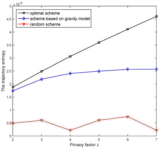 Figure 10 compares the trajectory entropy of the proposed trajectory protection scheme with the optimal scheme and the random scheme. Similar to Figure 8, it can be seen that the trajectory entropies of the three schemes increase with the privacy factor k increasing. The trajectory entropy of the proposed scheme is larger than that of the random scheme and smaller than that of the optimal scheme. Moreover, the trajectory entropy performance of our scheme is 5.18 times higher than that of the random scheme on average. This means that the trajectories generated by our scheme have better uncertainty and are not easily cracked by the adversaries, i.e., the privacy level of our scheme is higher than that of other schemes.